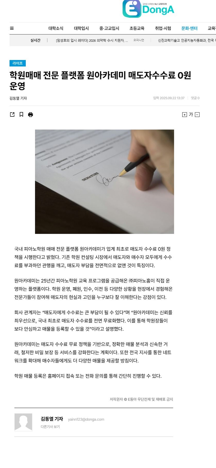 제목 | 원아카데미는 다릅니다. 매도자 수수료 0원 / 동아일보 기사 | ||||